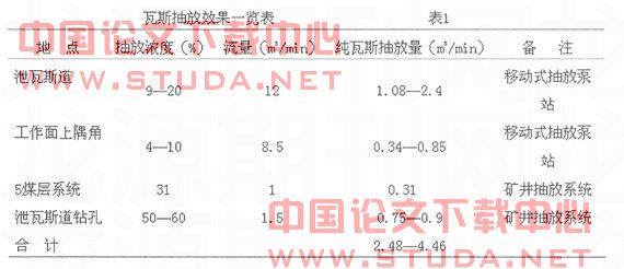 通过方案的实施,T2 1 9 5工作面回风瓦斯0.4%,泄瓦斯道回风瓦斯0.6%,工作面上隅角瓦斯0.6%,各抽放系统抽放情况如表1