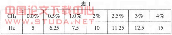(3)调精度:传感器凋零后,按一下遥控器的“转换”。传感器进入调精度状态,此时传感器的千位数显示‘1’,并闪烁。对流量计输入端输入0~3%的CH4标准气,调整流量使流量为200mL/min,待读数稳定后,通过遥控器的“上”“下”,使传感器的显示数值与所用标准气体浓度一致,然后查看面板上频率表输出的数字是否与传感器的输出频率相吻合。(传感器的输出频率可由说明书决定的频率上出来如本例可查看下表读取频率数)。