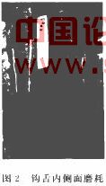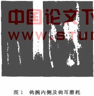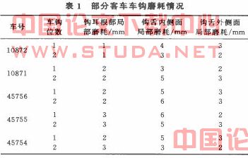 装用小间隙车钩后,该列车的纵向冲动性能较同类型车辆得到了明显改善,旅客的乘坐舒适度得以提高。但经过半年时间的运用,于1999年7月解车整修时发现,2组车中所有的车钩(动车组首尾两端车钩除外)均发生严重磨耗(见图1一图3,表1),同时,缓冲器处于不工作状态(无压缩痕迹,缓冲器为G1型大容量缓冲器)。这在车辆运用中是罕见的。