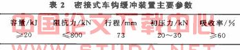 密接式车钩缓冲装置是刚性连接的自动车钩,车辆连挂时,车钩紧密连接,其间没有上下或左右的移动,纵向连接间隙为1 mm以下,使列车的纵向冲动水平大大下降,提高了列车的舒适度和安全性。该缓冲器的主要参数见表2.