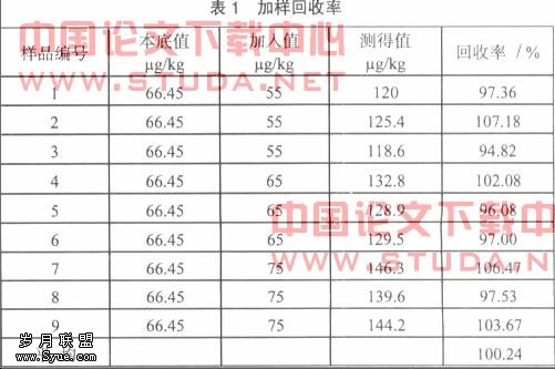 对同一样品(测定结果均值为66.45ug)分别加入Mn标准55ug、65 ug、75ug,结果回收率为94.82%~107.18%,平均回收率为100.24%,完全能够满足方法的要求。