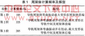 如图2为尾架系统的有限元模型,考虑到实际情况,将尾架导轨与两导轨座作为一体处理,尾架体与导轨之间以互为接触单元为主,每个导轨座均布4个全约束点,系统共有单元7 049个。得到尾架系统前三阶振型如图3(a),3(b),3(c)所示。表1列出了尾架系统计算频率及振型特性。