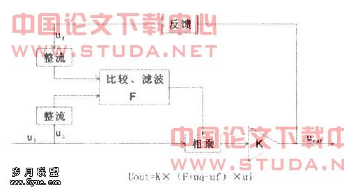 由图和数学算式可以看出,输出Uout主要由K和F决定,前馈信号uq和反馈信号uf是反相的,经比较求和,决定输入电压ui相乘的系数(F+uq+uf),此系数变化反映了输出电压误差量的大小,由此补偿输出电压的误差。以上是放大器的数学模型,要用物理器件来实现,拟定出以下电路,前馈电路和反馈电路仍保持原电路,整流电路用运放精密整流,比较求和电路用运放求和电路,如果前馈信号uq取自CPU板上的0832的基准,可直接将前馈信号uq接求和运放的正相端,求和电路兼有滤波作用,输出反映输出电压误差的直流,此直流要与输入信号ui相乘,乘法可通过两种途径来实现,一种是用专用乘法器AD633;另一种是用分立元件,做一个带恒流源的差分放大器,用直流去控制差分电路的恒流源大小,也可以实现乘法作用,最后视情况而定。