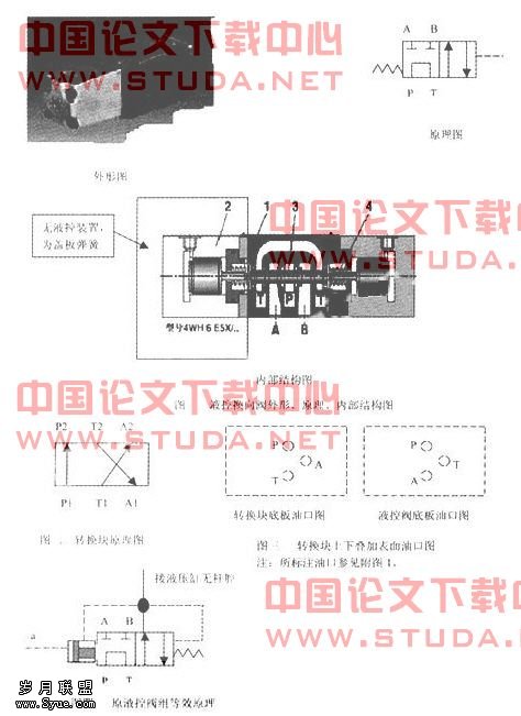 经过现场检测,在不能下降时,MP32A、MP1测压头的压力为50~70bar,MP32B测压头的压力为70bar,判断液控换向阀存在问题。液控换向阀型号4WH6GA5X,因为与液压回路的功能要求相反(见图一,参照附图1),设计制造方在液控换向阀与阀块间增加了一个液压油路转换块(原理见图二),转换块上下叠加面油口布置图见图三,液控换向阀组等效液压原理图见图四。