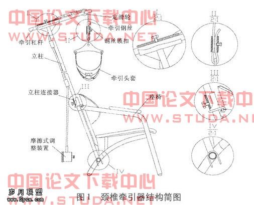结构如图所示。牵引力可在300N内调节,调节行程300mm,牵引角度可调。主要包括:牵引头套、控力装置、牵引杠杆、立柱、传力装置、座椅等部分。各部件可拆卸折叠,主要零件采用铝合金材料,质量轻,便于携带。立柱分两节,可根据需要适当伸缩确定高度;立柱底部通过U型卡件可与座椅快速连接,起到定位和限制立柱回转的作用;立柱中部由连接器固定在座椅靠背上;立柱上方与牵引杠杆通过滑套连接,牵引杠杆可前后滑动调节牵引角度。当牵引角度确定后可通过锁紧螺钉将其固定,满足治疗要求。传力装置由钢丝和滑轮组构成,把手轮上加载的作用力传递到牵引端。控力装置由锁紧旋钮、加载弹簧、卷筒、调力手轮、限位卡簧、外壳等部分组成。工作时先松开锁紧旋钮,减小锁紧摩擦力,转动调力手轮使钢丝缠绕在卷筒上,可以很轻松的进行牵引力的调节,当牵引力调整适度时,通过调节旋钮压紧弹簧,产生预紧力。弹簧力作用在卷筒的侧壁上,使卷筒侧壁与弹性卡簧被迫压紧,当摩擦力大于牵引力时,卷筒被锁紧,完成了牵引力的施加。如发生异常情况,牵引力突然增大超过设定摩擦力时,卷筒发生相对滑动,实现了过载保护。牵引完成后可放松锁紧旋扭释放牵引力。