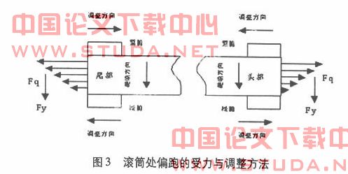 2.头部驱动滚筒或尾部改向滚筒的轴线与输送机中心线不垂直,造成胶带在头部滚筒或尾部改向滚筒处跑偏。如图3所示,滚筒偏斜时,胶带在滚筒两侧的松紧度不一致,沿宽度方向上所受的牵引力Fq也就不一致,成递增或递减趋势,这样就会使胶带附加一个向递减方向的移动力Fy,导致胶带向松侧跑偏,即所谓的“跑松不跑紧”。