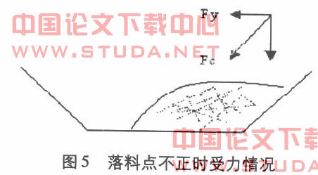 4.转载点处落料位置不正对造成胶带跑偏,转载点处物料的落料位置对胶带的跑偏有非常大的影响,尤其在上条输送机与本条输送机在水平面的投影成垂直时影响更大。通常应当考虑转载点处上下两条皮带机的相对高度。相对高度越低,物料的水平速度分量越大,如图5所示:对下层皮带的侧向冲击力Fc也越大,同时物料也很难居中。使在胶带横断面上的物料偏斜,冲击力Fc的水平分力Fy最终导致皮带跑偏。如果物料偏到右侧,则皮带向左侧跑偏,反之亦然。