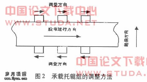 搞清楚了承载托辊组安装偏斜时的受力情况,就不难理解胶带跑偏的原因了,调整的方法也就明了了。第一种方法就是在制造时托辊组的两侧安装孔都加工成长孔,以便进行调整。具体调整方法见图二,具体方法是皮带偏向哪一侧,托辊组的哪一侧朝皮带前进方向前移,或另外一侧后移。如图二所示皮带向上方向跑偏则托辊组的下位处应当向左移动,托辊组的上位处向右移动。