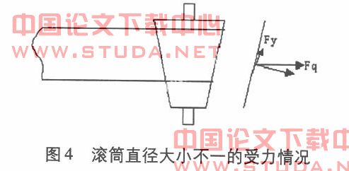 3.滚筒外表面加工误差、粘煤或磨损不均造成直径大小不一,胶带会向直径较大的一侧跑偏。即所谓的“跑大不跑小”。其受力情况如图四所示:胶带的牵引力Fq产生一个向直径大侧的移动分力Fy,在分力Fy的作用下,胶带产生偏移。对于这种情况,解决的方法就是清理干净滚筒表面粘煤,加工误差和磨损不均的就要更换下来重新加工包胶处理。