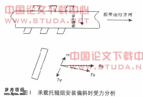 1.承载托辊组安装位置与输送机中心线的垂直度误差较大,导致胶带在承载段向一则跑偏。如图1所示,胶带向前运行时给托辊一个向前的牵引力Fq,这个牵引力分解为使托辊转动的分力Fz和一个横向分力Fc,这个横向分力使托辊轴向窜动,由于托辊支架的固定托辊是无法轴向窜动的,它必然就会对胶带产生一个反作用力Fy,它使胶带向另一侧移动,从而导致了跑偏。