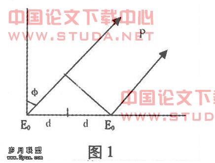 航向天线阵最基本的组成是每一对与中心线等距的天线单元。为了说明空间合成信号的方向性图。这里引入了天线理论中二元点阵概念。如图1,两个距中心为d的天线单元1和2,辐射信号为E0,在远场某处P,单元1和2的场强差异可以忽略,但由于路径的差而导致一个相位差。由于是在远场,单元1、2至P点的路径可以认为是平行的,由此得出相位差θ=2π*2dsinφ/λ=2kdsinφ单位为弧度,其中k=2π/λ。