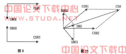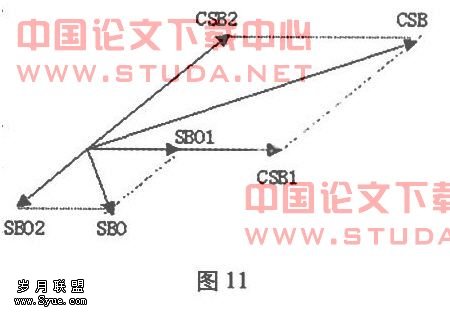 如果讨论一下另外的一个特殊情况,就是SBO信号进行移相90度,使左天线中CSB1与SBO1同相,则右天线中CSB2与SBO2反相,根据矢量图11,我们发现合成信号CSB与SBO始终正交,无法产生空间调制,DDM为0。