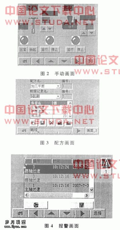 根据系统要求,控制系统需要有手动和自动两种工作方式,因此需要有手动和自动画面。手动画面可以手动选择各个部件的开关;可以在各自允许的范围内任意设定参数值,实现各电机的无级调速、磁场的大小、蠕动泵流速的大小。图2为自动画面中主轴和平摆的开关和转速设定及显示画面。自动画面采用配方功能来实现加工平面和加工球面两种工艺,图3为加工平面的配方视图,在每一种配方下有设有几种参数,工作时任意选定一种参数,机器的各个部件即按照也设定好的参数自动运行。