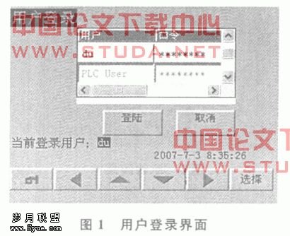用户管理界面中可以为各用户组态不同的组和权限,例如可以组态用户为操作员、管理员、工程师等组。管理员权限最高,拥有所有的操作权限,管理员组最低,只能进行操作不能进行任何参数的修改。工程师组可以访问“参数设置画面”和输入设定值。另外每个用户登录时必须输入正确的密码才能进行相应的操作。用户登录界面如图1示。