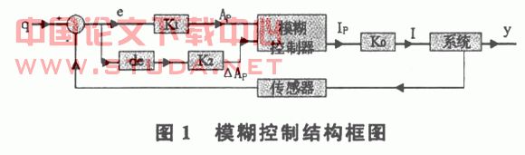 模糊控制特别适用于存在参数时变、非线性、强耦合系统,这类系统的精确数学模型的建立困难很大,甚至于无法建模。模糊控制是通过模糊控制器来实现的,模糊控制器是对人脑所具有的模糊推理机能的模拟。它是应用模糊数学的知识,模拟人的思维方法,把人类语言描述的控制策略改造成模糊控制规则,依据规则确定控制量。模糊控制基于模糊控制规则、经推理后控制被控对象,鲁棒性强。模糊推理控制在智能结构振动控制中已有较多的应用。本文采用模糊推理策略,设计了相应的模糊控制器,实现控制电流的输出控制。模糊控制结构框图如图1所示: