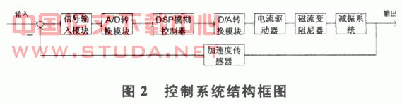 如图所示,控制系统硬件平台由加速度传感器、信号输入模块、A/D转换模块、DSP控制器、电流驱动器、磁流变阻尼器以及减振平台等部件组成。系统用加速度传感器采集减振平台垂直加速度,然后对采集的信息进行分析、处理,并向执行元件发出控制指令,最后产生动作。?