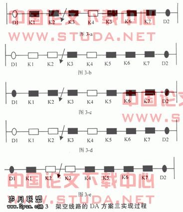 主站收到FTU故障信息,确定出故障发生在开关K2-K3间,遥控跳开K2和K3,隔离成功后,闭合D1和联络开关K4,恢复供电(图1-d)
