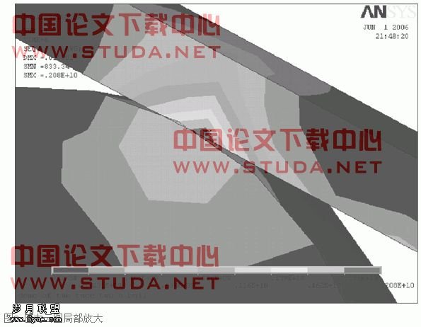 同时从仿真的结果可以看出,由于存在相对运动,钢丝与滚动体之间产生摩擦,由于摩擦的存在,使接触区相对于静态情况下产生了一定的变化。具体体现在:首先,接触区域影响区域变大。在静态情况下,接触应力仅在接触点附近很近的很小的范围内存在,此处应力值很大,随着与接触区的距离的增加,接触体内的接触应力就迅速减小到可以忽略的程度,这与非协调接触理论定性分析的经典定理——圣维南定理相吻合。而在工作过程中,产生相对运动和摩擦的情况下,接触区有应力的范围大大的增加,这是因为,在相对运动的过程中,接触区的接触应力已经超过了材料的屈服极限,所以运动的过程中,接触区将产生塑性变形,在脱离接触区后,仍旧有一定的残余变形,从而导致有一定的残余应力。