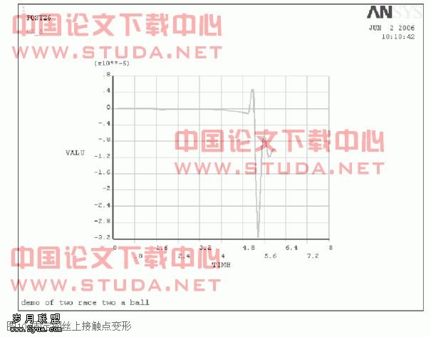 用时间历程后处理器进行观察如图9,图10,取钢丝滚道与滚动体相对运动路径上的某点为研究对象。从钢丝上点的变形随时间的变化情况可以看出:由于接触应力超过了材料的屈服极限,上下滚道均产生塑性变形。主动钢丝上的塑性变形约0.12mm,固定钢丝上的塑性变形约0.08mm。主动钢丝上产生的塑性变形要大于固定钢丝上产生的塑性变形,这与我们模型施加载荷的方式有关,由于所施加的预紧和钢丝之间轴向的相对位移均加在上钢丝上,从而使该钢丝产生的应力要大于被固定的钢丝中的应力,因此,塑性变形的量也要略大。