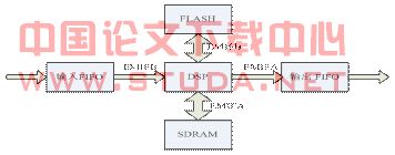 本模块的主要数据流程如下图。从图中可以看出,DSP主要包括三个外围器件,即FIFO,FLASH和SDRAM。其中FIFO是用来缓冲输入输出数据,FLASH主要用来上电引导程序,SDRAM主要用来存储数据处理过程中需要用的的一些数据。