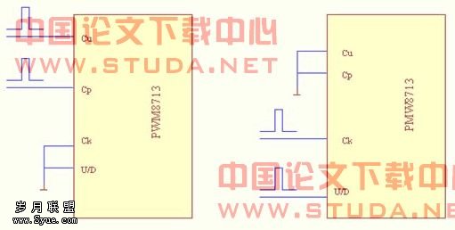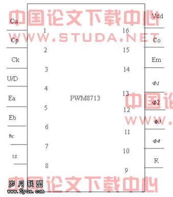 PMM8713 是专用的步进电机的步进脉冲产生芯片,它适用于三相和四相步进电机。如图1 所示PMM8713 的引脚,Cu 为加脉冲输入端,它使步进电机正转,Cp 为减脉冲输入端,它使步进电机反转,Ck