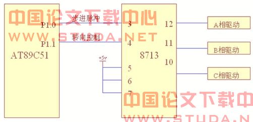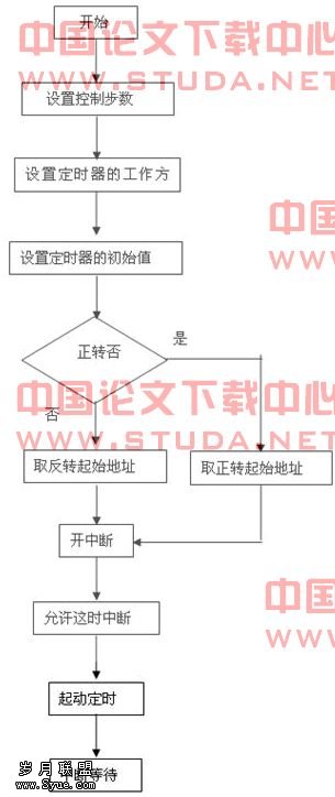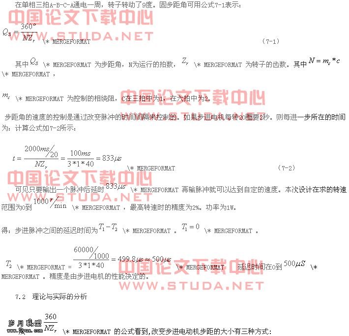 3) 与定子控制绕组的通电方式有关。要改变步进电机步距角的大小也只能通过这三种方式。设计中步进电机为三相,功率为1W。因步进电机的转子上没有绕阻而是由40个小齿均匀地分布在圆周上。定子的齿也是固定不变的,通电方式是选取用三相单三拍方式。可见步进电机的一但选定,其步距角就不能再改变了。要改变转束也就只能通过脉冲之间的延时来改变。但对步进电动机的步距角的控制,可以实现对步进电动机的转速精度控制。
