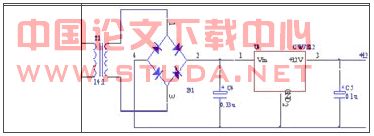 220V,50HZ的交流电压变压后,输出+15V左右的交流电压其频率仍为50HZ,交流信号经桥式整流电路进行全波整流,然后,经电解电容滤波。最后,经CW7805(三端固定稳压器)输出的便是一个平稳的+12V的直流电压信号。电容C4和C5的作用是滤高频波和抑制自激振荡。
