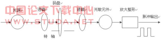 光电编码器,是一种通过光电转换将位移量转换成脉冲或数字量的传感器。这是目前应用最多的传感器,光电编码器是由光栅盘和光电检测装置组成。光栅盘是在一定直径的圆板上等分地开通若干个长方形孔。由于光电码盘与电动机同轴,电动机旋转时,光栅盘与电动机同速旋转,经发光二极管等元件组成的检测装置检测输出若干脉冲信号,其原理示意图如图1所示;通过计算每秒光电编码器输出脉冲的个数就能反映当前电动机的转速。