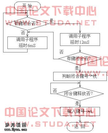 键盘的连接一般有两种方式,一种是独立式键盘;一种是行列式键盘。独立式键盘就是各个键相互独立,每个键盘接一根输入线,通过检测输入线的电平状态来确定那个键按下。这种键盘的输入线较多,结构复杂,一般适用于按键较少操作速度较高的场合。而行列式键盘是由行和列线交义组成,一般用于按键较多的场合。本次设计一共用9个键因此采用行列式键盘。具体的原理图如4-4-2所示: