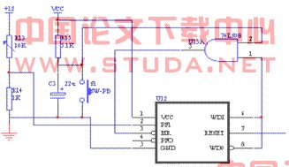 本电路巧妙的利用了MAX813L的手动复位输入端。只要程序一旦跑飞引起程序“死机”,WDO端电平由高到低,当/WDO变低超过140ms,将引起MAX813L产生一个200ms的复位脉冲(本次设计中将MAX813L的RET端同时8031、8155的复位端RESET相连,使之同时复位)。同时使看门狗定时器清0和使引脚变成高电平。也可以随时使用手动复位按钮使MAX813L产生复位脉冲,由于为了产生复位脉冲端要求低电平至少保持140ms以上,故可以有效的消除开关抖动。