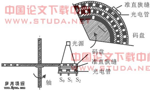 但实际上步进电机在用行时是带有一定量的负载,当运转时会存在许多误差,同时因为负载的存在可能引起失步和震荡。这就使步进电机不能按预定的运行,从而是很难达到转速精度的要求。为准确测量电机的转速稳定度,须选用高精度测量仪器。光电编码器因光电式数字输出而更具抗干扰性强和处理简便的优势。增量式旋转编码器如图7-1 所示。其核心部件为光栅码盘,玻璃盘表面的光栅道数决定了编码器的分辨率,而后者制约了转速测量的精度。当编码器分辨率与系统误差相近时,其影响将不复存在。