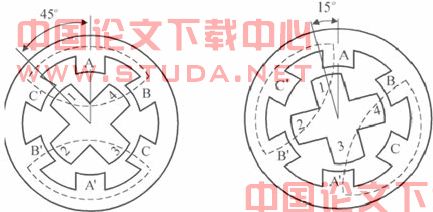 电动机定子铁心和一般电机一样由硅钢片叠成,铁心内孔表面有开口槽。转子装有一个轴向磁化永磁体用以产生一个单向磁场。永磁体产生的磁通,在每一个气隙圆周上都是单方向通过气隙的,这时作用在气隙中的磁势是同极性的,称为单极磁势。而转子包括两段,一段经永磁体磁化成N 极,另一段磁化为S 极,每段转子齿以一个齿距间隔均匀分布,但两段转子的齿相互错开1/2 个转子齿距。A) N 极段截面图 B) S 极段截面图如图1-4所示: