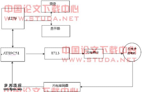 因本次设计的要求,选用三相三拍步进电机,单片机选用89C51作为控制器。选取用8279来驱动显示和键盘。选用8713作为步进电机的驱动芯片并通过光电耦合来驱动步进电机。然后由于步进电机同轴的光电编码器作为反馈元件,并把反馈回的信号经CPU处理后再由显示器显示出来。但由键盘输入的速度数值了得通过显示器来显示,固本次设计要两排显示,一排来显示给定的转速一排来显示实际的转速。系统原理框图如3-1所示: