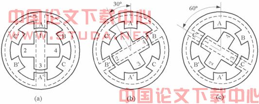 当A 相控制绕组通电,其余两相均不通电,电机内建立以定子A 相极为轴线的磁场.由于磁通具有力图走磁阻最小路径的特点,使转子齿1, 3 的轴线与定子A 相极轴线对齐,如图4-4 (A)所示.若A 相控制绕组断电,B 相控制绕组通电时,转子在反应转矩的作用下,逆时针方向转过30,°使转子齿2,4 的轴线与定子B 相极轴线对齐,即转子走了一步,如图4-4(B)所示, 若再断开B相,使C相控制绕组通电,转子又转过30° 使转子齿1,3 的轴线与定子C相极轴线对齐,如图4-4(C)所示.如此按A-B–C-A 的顺序轮流通电,转子就会一步一步地按逆时针方向转动,其转速取决于各相控制绕组通电与断电的频率,旋转方向取决于控制绕组轮流通电的顺序若按A-C-B-A 的顺序通电,则电机按顺时针反方向转动.