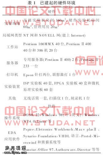 EDA(实验)中心的建设起始于1998年初,学校先后投入资金近百万元,第一期工程建立起配备有40台Pentium 166MMX微机的多媒体实验室和硬件实验室各一个;1999年进行了第二期工程,又建起了一个包含40台PentiumⅡ400微机和两台专用服务器的实验室和一个管理办公室。并进行了软件建设和有关实验项目的开发。到目前为止已建立起的软硬件环境如表1。