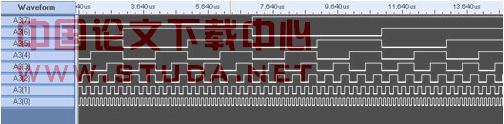 通过逻辑分析仪测量板卡的输出波形,得到输出低8位结果见图5-6。在源程序中写入的数据为pData数组,它的取值是从0开始依次加1,因此从最低位开始往上一位走,依次为2分频。而从输出波形可以看出,输出完全符合写入的数据,数据输出的速率为16 MHz。