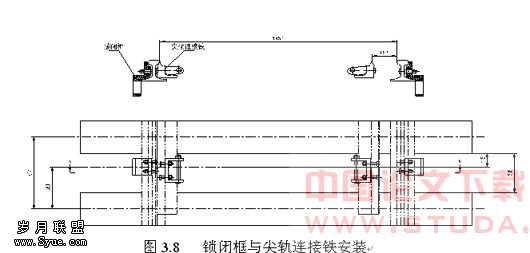 b.将两侧的锁闭框和尖轨连接铁分别安装在两侧的基本轨和尖轨上,如图3.8,安装前需将安装侧的尖轨拨离基本轨。锁闭框安装螺栓应大约在锁闭框安装长孔的中心位置,并暂不拧紧,便于随后调整。