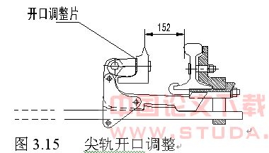 首先通过调整动作连接杆与转辙机动作杆连接的活动接头使两侧尖轨在道岔锁闭状态时的开口接近152mm,并且相差不超过3mm,然后检查道岔开口是否符合规定要求,若一侧开口大于要求值,可通过增加尖轨连接铁与尖轨间的调整片进行调整(如图3.15),反之则通过减少尖轨连接铁与尖轨间的调整片进行调整,调整片的增减量一般与开口的需调整量相当。当本侧开口调整达到要求,转换道岔,以同样方式进行另一侧开口的调整。两侧开口值在规定范围内应尽量一致。