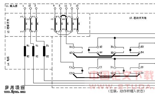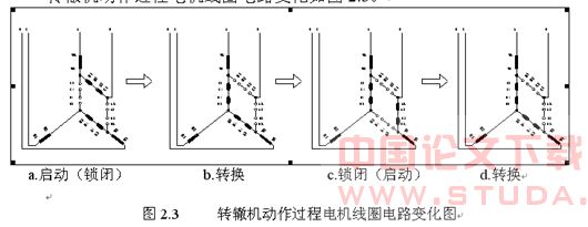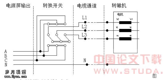 广州地铁二号线信号系统道岔是由系统联锁软件和接口单元进行驱动。在系统联锁软件和接口单元没有达到使用条件的前提下,要对道岔室外部分进行通电调试,须根据转辙机驱动原理自制一套模拟驱动电路,如图3.17。改变输入到转辙机的三相交流电的相序可使转辙机反复动作,通过输入到转辙机电机W、V线圈的相位的相互交替来达到此目的。