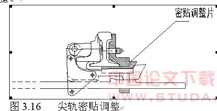 通过逐步增减锁闭铁和锁闭框之间的密贴调整片保证尖轨和基本轨密贴,如图3.16。若道岔锁闭状态时尖轨与基本轨有明显缝隙,可增加密贴调整片进行调整,若转换过程中尖轨与基本轨已经密贴但道岔无法锁闭或明显感到锁闭非常吃力,说明密贴过紧,可减少密贴调整片进行调整。