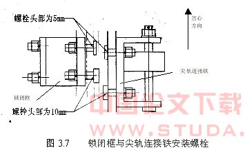 由于尖轨连接铁一颗安装螺栓与锁闭框一颗安装螺栓的头部在尖轨与基本轨之间缝隙中相抵触(如图3.7),因此螺栓头部应比标准螺栓头部薄(标准为10mm),如果厂家到货没有进行特殊加工,则施工单位应在施工前将此处螺栓头部做加工处理,如图3.3。