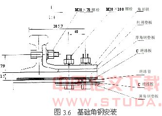 c.将长基础角钢与角形铁连接,中间加入绝缘垫板、绝缘管和钢垫板等,暂不拧紧连接螺栓,以便短基础角钢能够与长基础角钢顺利连接。