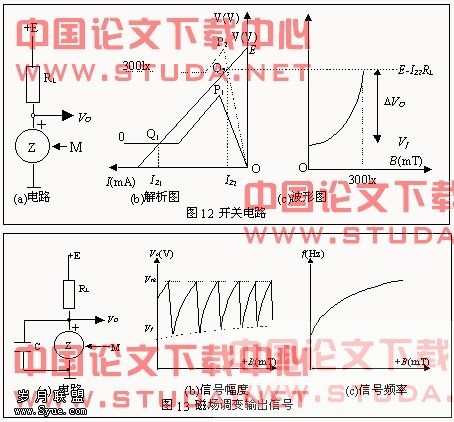 | 1. 工作在M3区输出阶跃信号 磁敏Z-元件工作在哪一个区,与电源电压E的大小有关。在温敏Z-元件工作中,由M1区向M3区转换的过程中,电源电压E,负载电阻RL与Z-元件的参数Vth 、Ith,必须满足的条件-状态方程为: E= Vth +IthRL (7) 该方程仍然适用于磁敏Z-元件。 图12是输出阶跃信号的电路图,工作状态解析图和信号波形图。为了保证Z-元件工作在M3区,P(Vth,Ith)点必须设定在负载线(E,E/RL)的左侧,并应考虑温度的影响,在应用的温度范围内,能可靠地工作在M3区。 从解析图中已知道,无磁场时工作点为Q1(Vf,IZ1),输出为VO=VOL=Vf。加入300mT磁场,P1(Vth1,Ith1)移至P2(Vth2,Ith2),P2点在直线(E,E/RL)的左侧,Q2(VZ2,IZ2)点在OP2上,这时的输出为:VO=VOH=E- IZ2RL |