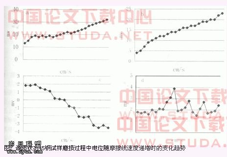 分别选择调质和淬火态的45钢、铸态及经水韧处理的高锰钢为试验材料,试样尺寸Φ10×20,磨损试验在ML-10型磨损试验机上进行。试样上加载的砝码重量为500g,对磨材料分别选择32号、100号氧化铝砂布及320号、500号绿色碳化硅砂纸,试验中每次更换试样都相应地更换砂布(纸),以保证试验条件的等同性。试验装置如图1,托架直径300mm,转速90转/分,试验过程中试样在砂布(纸)上往复运动,摩擦线速度连续变大或变小。图2~5分别是线速度由小增大时,上述4种材料的试样在不同砂布(纸)上磨损过程中电位的变化情况。
