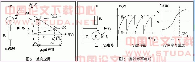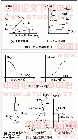 Z-元件反向电流极小,呈现一个高电阻(1~6MW),这个电阻具有负的光照系数,并在较高电压(30~40V)下,不发生击穿现象。图5 为反向应用电路及工作状态解析图。可以看出在无光照时,L1=0,工作点为Q1(VZ1,IZ1),输出电压为VO1,则: