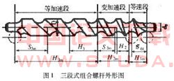 图1所示三段式组合螺杆是典型的要嗓距分件螺杆。在螺杆起始段。为了改善进瓶的平稳性,采用等螺距实现等速送料;在中间段,螺杆的供送加速度由零值依正弦函数变化增至最大值,为变加速度段;在后段,瓶子加速运动,以便逐渐增大进瓶的速度和间距,最终与拨瓶星轮同步,为等加速度段。由于变螺距螺杆螺旋线的特殊性,在等加速度段和变加速度段上,螺距关于螺旋线圈数变量的函数是多项式方程,所以不能直接采用变螺距螺旋扫描特征命令对其造型。由于供送螺杆是以螺杆和被供件的空间相贯运动为特点的,两者的相对运动范成出变参数螺杆的槽型,采用范成法构造螺杆三维实体模型,可复现变螺距螺旋曲面的包络形成原理,精确构造出螺杆的各段螺旋曲面。