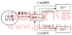 系统采用客户机/服务器模式(C/S模式).将各个用户的CAD部件设计以CAD文件(后缀为dwg)的形式传输到网络平台上,在网络平台上将各个CAD文件组合到一起,然后把组合后的CAD文件传输给各个用户,从而实现CAD设计的整体共享.图1为系统设计示意图。