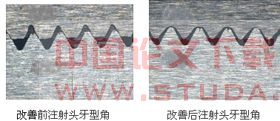 注射头、料筒硬质合金材料优选高耐磨、超细微颗粒的硬质合金,既要考虑硬度也要考虑韧性,如我司开始使用的富士F10材料就因为脆性较大,易出现崩裂问题,寿命不高。后降低硬度改为F20后,注射头、料筒的使用寿命得到显著提高;另外需强调注射头连接内螺纹孔加工的合理性,若采用烧结成型的螺纹,由于牙形角不规则,牙底尖角应力集中,使用寿命较低,容易出现拉断现象,因此要求注射头内螺纹采用电火花加工,牙底尖角圆弧过渡,则改善了注射头因螺纹孔加工不规范造成拉伤现象的发生。