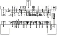 结合零件的结构特征,从定位精度,及保证零件的使用性能等要求,设计出如下的顺送模具(级进模)结构简图(图3)