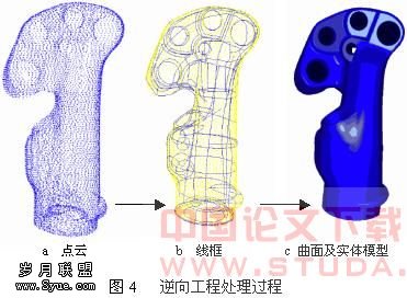 如何得到部件精确的电子数据模型,是CA精铸至关重要的第一步。随着三维CAD软件、逆向工程等技术的发展,这项工作变得简单而且迅捷。在此主要介绍利用IDEAS进行实体建模和数据转换的过程。IDEAS9集成了三维建模与逆向工程建模模块。通过MasterModeler模块可以得到复杂模型(见图2),既可以进行全几何约束的参数化设计,又可进行任意几何与工程约束的自由创新设计;曲面设计提供了包括变量扫掠、边界曲面等多种自由曲面的造型功能。逆向工程Freeform可将数字化仪采集的点云信息进行处理,创建出曲线和曲面,进行设计,曲面生成后可直接生成RPM用文件,也可传回主建模模块进行处理(见图4)。实体文件生成后需转变成STL文件(见图3)以作为RP设备的输入。转换过程应注意选择成型设备名称,通常选用SLA500,三角片输出精度在0.005~0.01之间。采用MagicRp处理时应注意乘上25.4,得到实际设计尺寸。